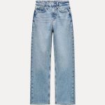 High-waisted five pocket jeans. Washed effect. Straight leg and unfinished hem. Front zip and metal button closure